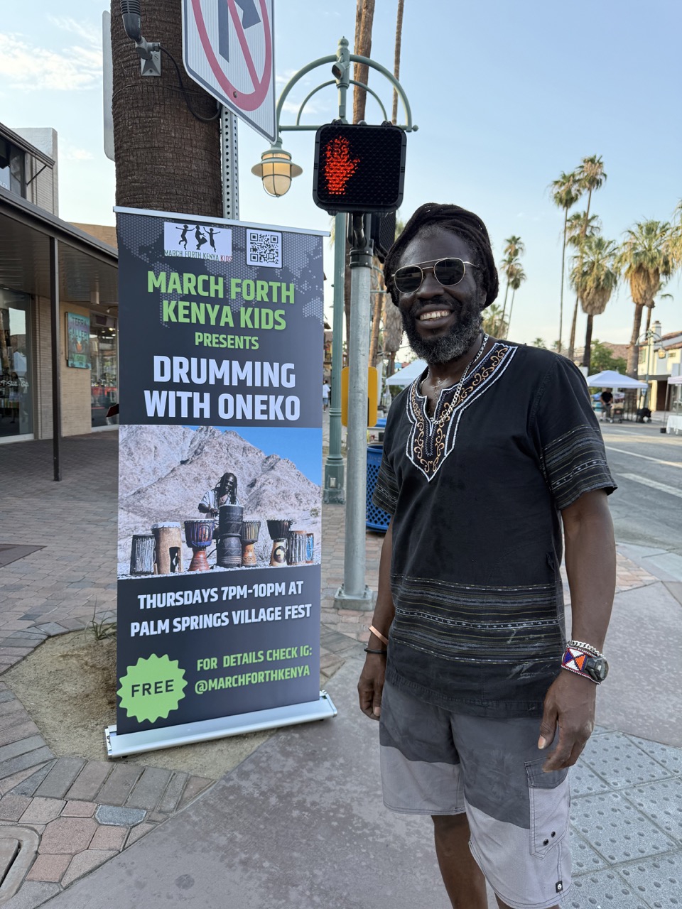 You will find us almost 1-2 times per month between February and November offering a free community drum session in downtown Palm Springs during their weekly Village Fest! We are official "entertainers" approved by the Board of the Palm Springs Village Fest. We host these drum sessions on Thursday nights during Village Fest at different locations...